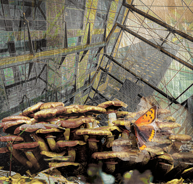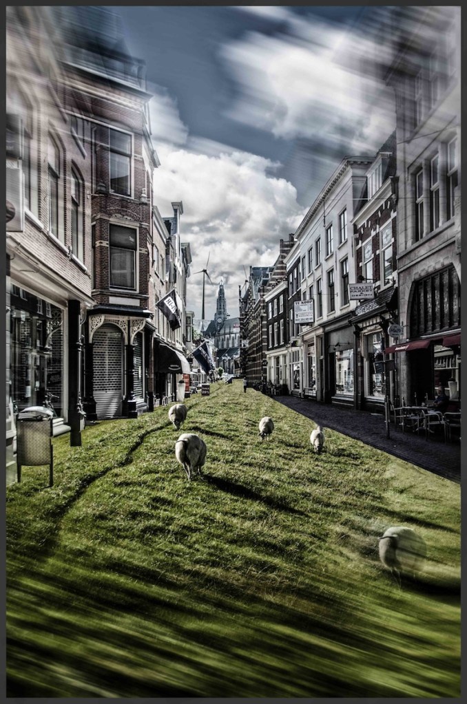 De afbeelding op de flyer is n.a.v. het werk ‘ongerijmde stad’
